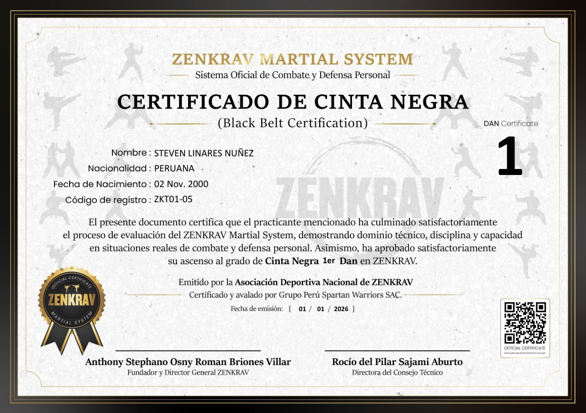 El presente instructor se encuentra oficialmente registrado dentro del sistema ZENKRAV Martial System, cumpliendo con los estándares técnicos, evaluativos y disciplinarios establecidos por la Dirección Técnica.